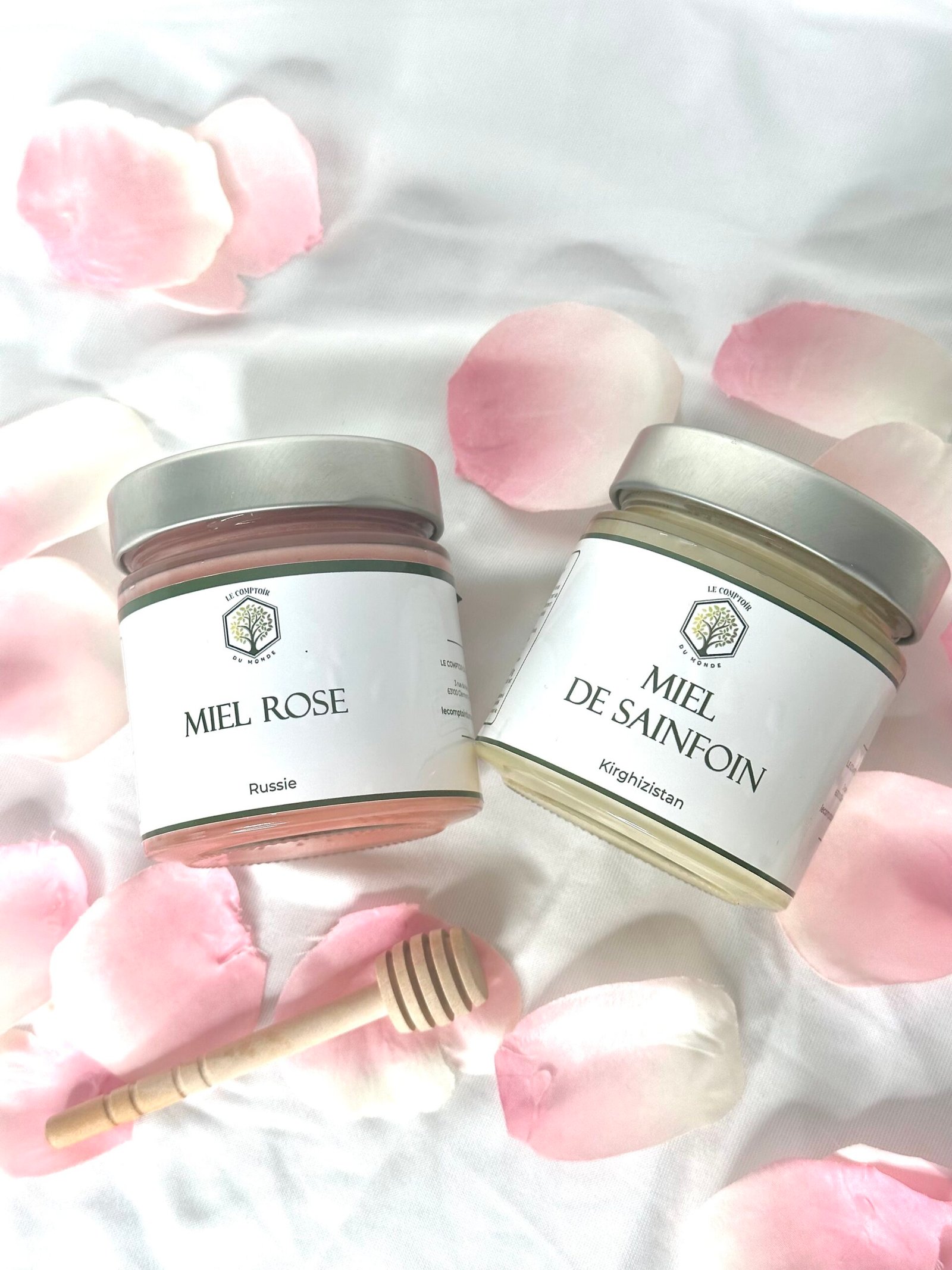 Ce coffret réunit deux des miels les plus prestigieux au monde : le miel blanc du Kirghizistan, réputé pour sa texture crémeuse et sa pureté, et le miel rose de Russie, apprécié pour ses arômes floraux et sa teinte délicate.