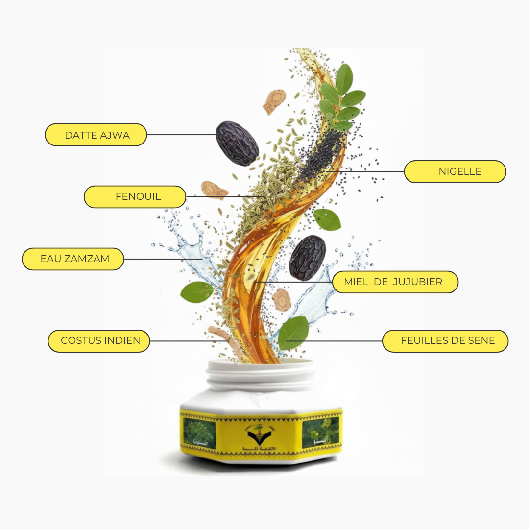 Le pot 7 guérisons est un mélange exceptionnel de plusieurs ingrédients élaboré par le centre de recherche Saoudien situé dans la ville de Médine. Le dosage de chacun des produits a été calculé afin de permettre une action ciblée sur plusieurs points, de façon à optimiser son efficacité. Les nombreux cas cliniques font état de l’amélioration de l’état de santé de nombreuses personnes. De plus, des guérisons de certaines maladies ont même été constatées.